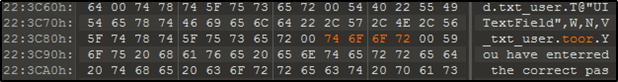 IDA 프로그램을 이용해 setTheTextfield 함수에서 특정 단어 root를 검색했다.