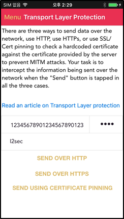 Diva 어플리케이션 실행 후 Transport Layer Protection 메뉴에서 정보를 입력하고 전송했다.