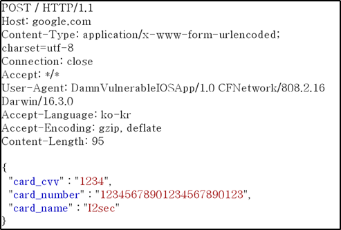 PC에서 BurpSuite Proxy를 이용해 중간에서 패킷 내용을 확인했다. 그림 1-1에 입력한 민감한 정보 내용이 보이는 것을 알 수 있다.