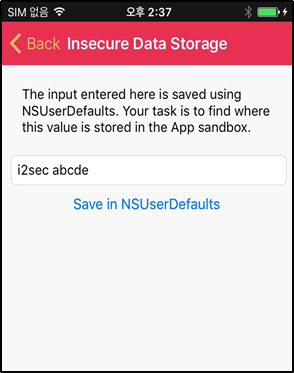 Insecure Data Storage -> NSUser Defaults에서 데이터를 입력한다.