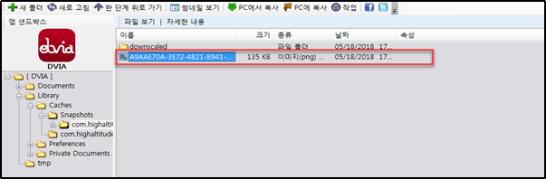 Data Container of App\Library\Caches\Snapshots\ 경로 하위에 스크린샷을 찍은 파일이 존재한다.