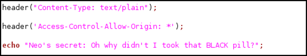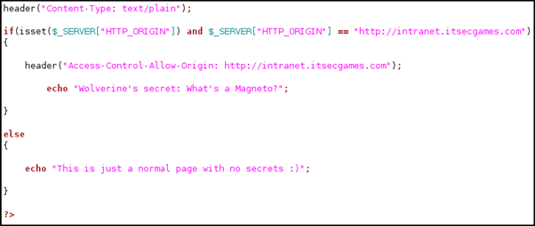 http://intranet.itsecgames.com 인지 확인하고, CORS 설정한 뒤에 Wolverine의 secret 값을 출력해 주는 것을 알 수 있다.