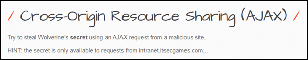 NEO 계정이 아닌 Wolverine 계정의 secret 값을 악성 사이트를 통해 탈취하라는 메시지가 보이고 힌트로, 오직 intranet.itsecgames.com로부터의 요청으로 secret 값을 알 수 있다고 되어 있다.