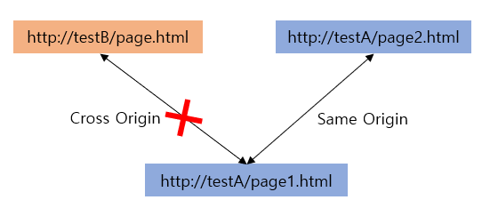 - 자바스크립트(XML Http Request)로 다른 웹 페이지에 접근할 때는 같은 출처(Same Origin)의 페이지에만 접근이 가능하다. 프로토콜, 호스트 명, 포트가 같다는 것을 의미