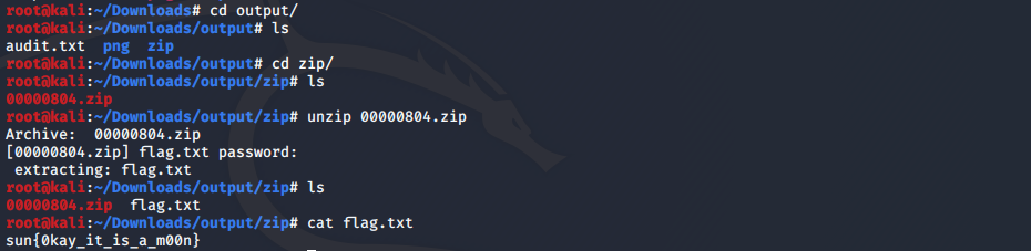 output 폴더를 통해 00000804.zip 파일을 찾았고 moon이라는 비밀번호 입력 해 압축을 풀어 flag.txt 파일을 찾았다.