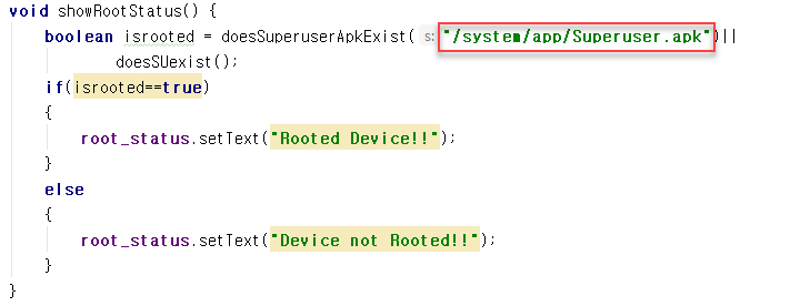 PostLogin 소스 코드를 보면 /system/app/Superuser.apk를 탐지함으로써 루팅여부를 파악할 수 있다.