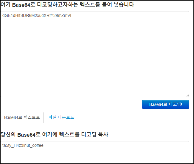 dGE1dHlfSDR6M2xudXRfY29mZmVI base64 디코딩한 결과 ta5ty_H4z3Inut_coffee 값을 얻을 수 있다.