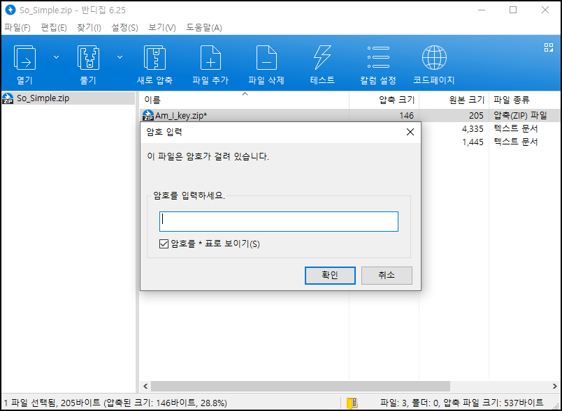 down 클릭 시 So_Simple.zip 파일을 열었는데 비밀번호가 걸려있는 것을 알 수 있다.