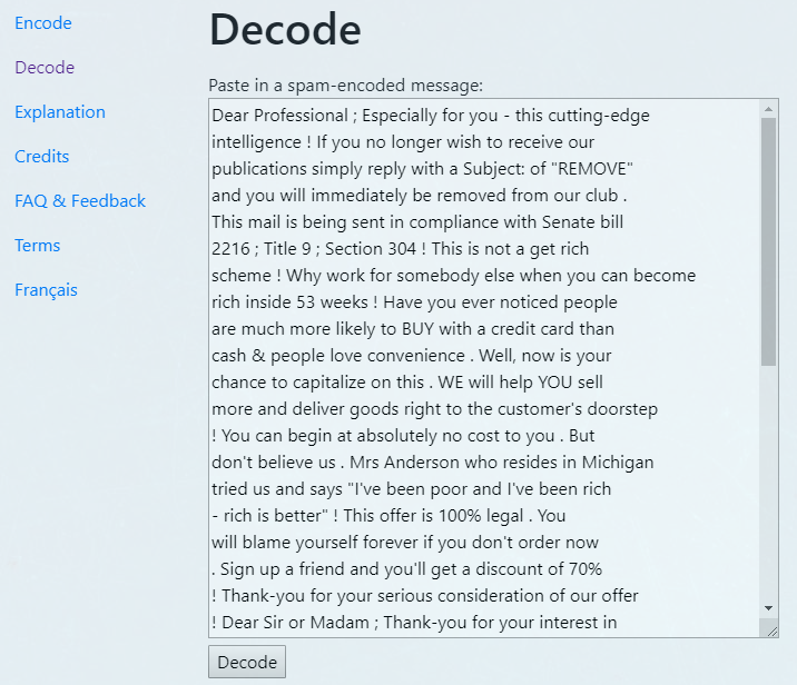 해당 문자열을 복호화하기 위해 사이트를 이용했다. (http://www.spammimic.com/decode.cgi)