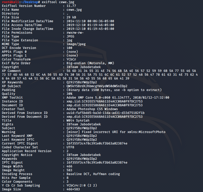 암호를 찾기 위해 exiftool 명령 어을 이용 해 cewe.jpg 파일을 보았는 데 수상한 16진수가 보이는 것을 알 수 있다.
