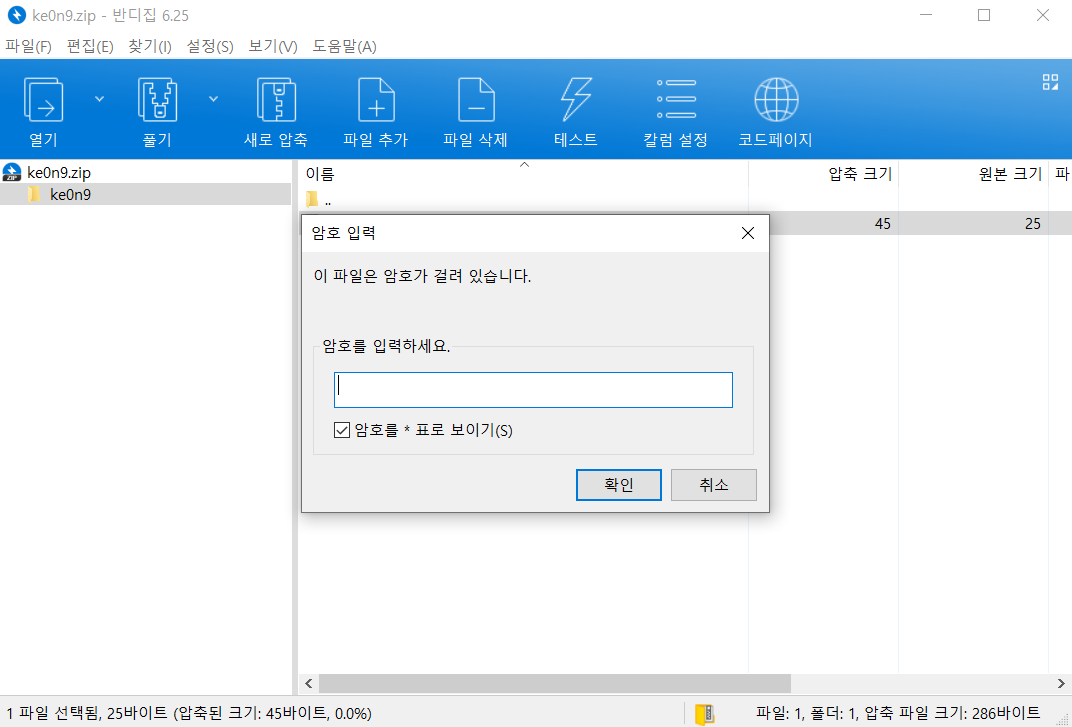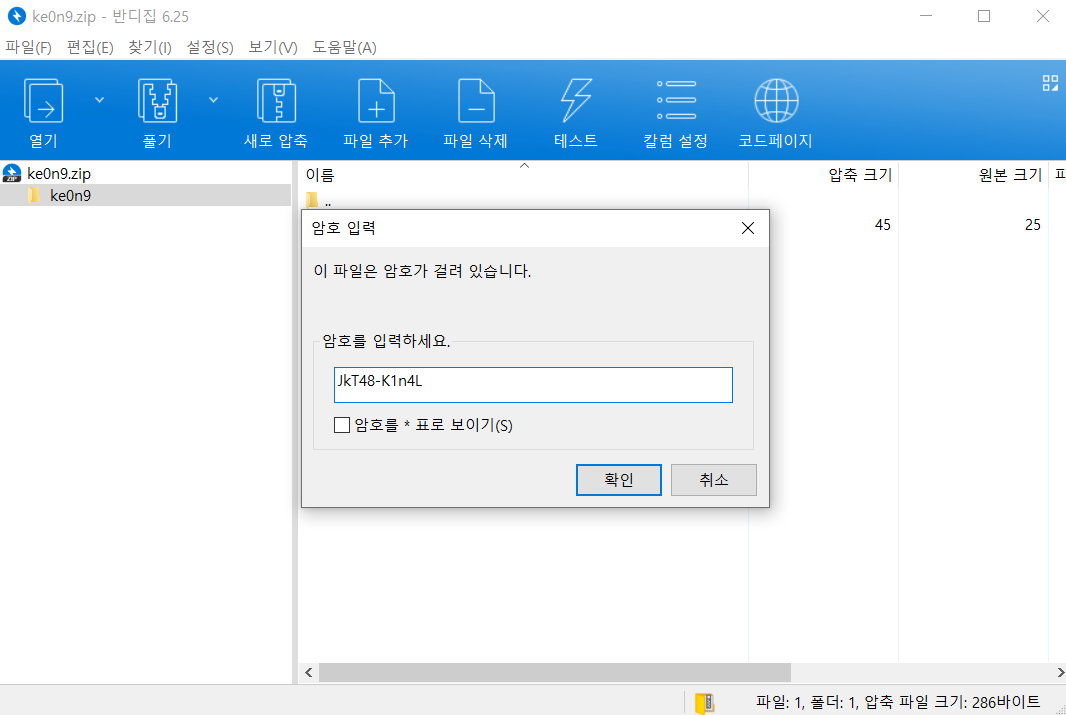 ke0n9.zip 압축파일을 풀려고 했는 데 암호가 걸려있는 것을 알 수 있다.