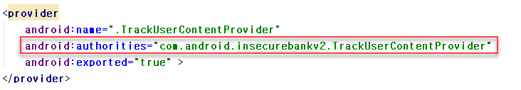콘텐츠 프로바이더를 통해 애플리케이션의 데이터가 유출되지 않도록 하기위해서는 프로바이더를 선언할 때 exported를 false로 선언해야 한다.