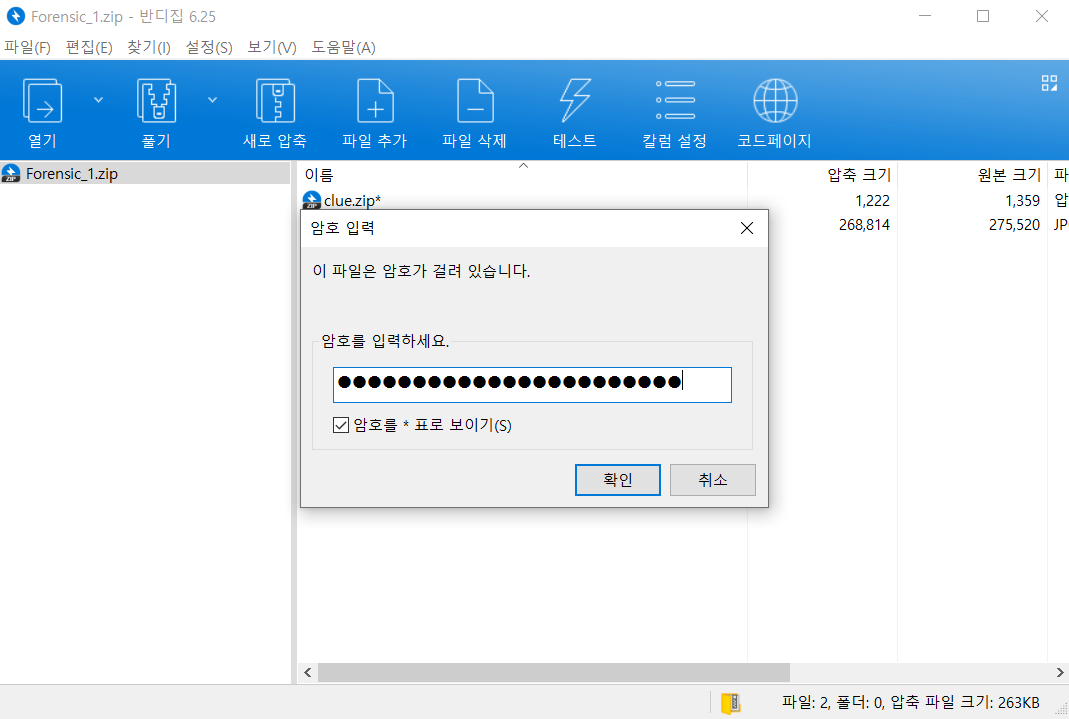 Forensic_1.zip 파일 다운로드해서 문제에서 보여주는 패스워드를 입력해 압축을 풀었다.