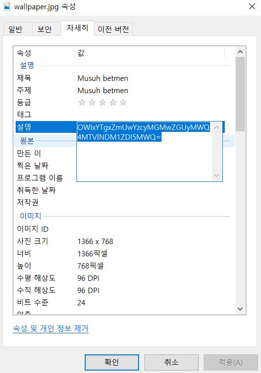 wallpaper.jpg 속성에서 base64로 인코딩을 찾았다.