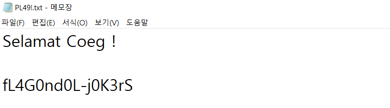 PL49!.txt 압축된 파일을 열어보니 FLAG 값을 확인할 수 있었다.