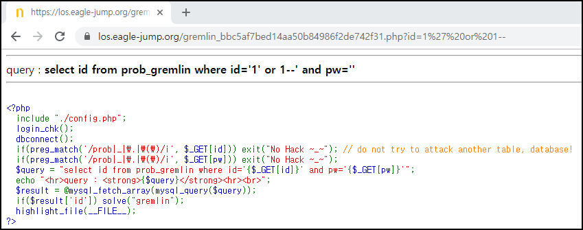 id=1' or 1 -- pw 부분을 주석처리를 시도했다.