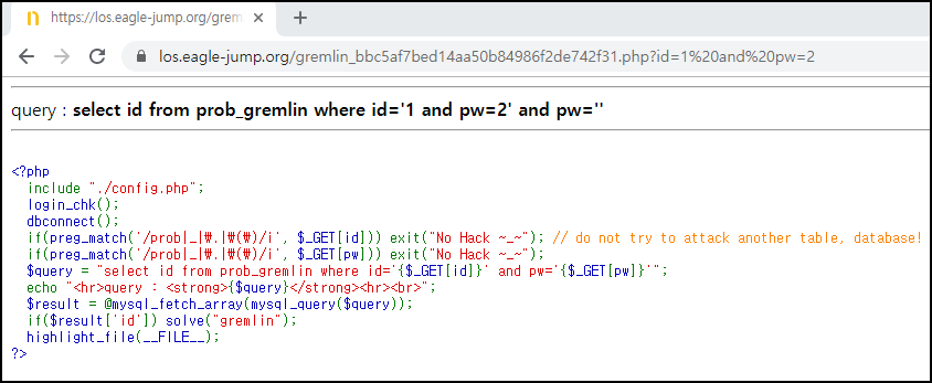 id=1 and pw=2 입력했을 경우 pw 부분에 들어가지 않는 것을 알 수 있다.