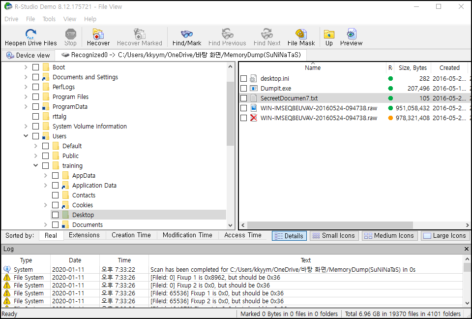 데이터 복구를 위해 R-Studio 프로그램을 설치해 cmdscan 한 경로를 확인한 결과 ScreetDoumen7.txt 파일을 확인했다.