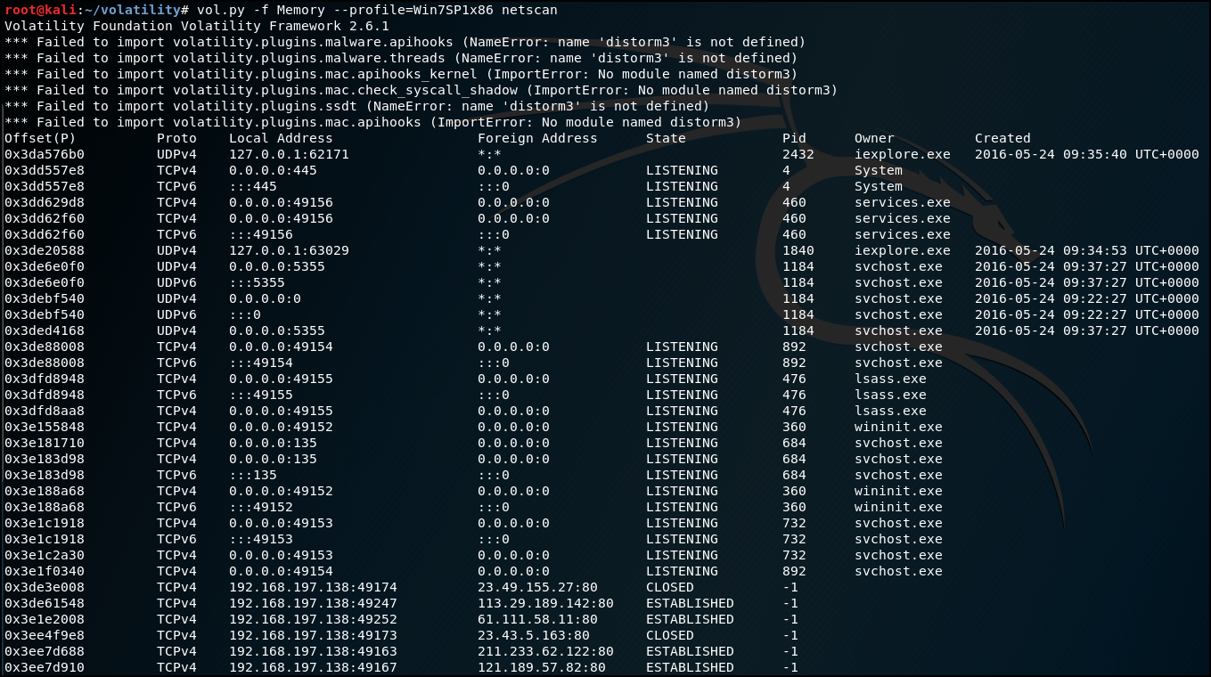imageinfo를 통해 Win7SP1x86를 확인한 내용 입력 후 IP와 port를 확인하기 위해 netscan 명령어를 사용했다.