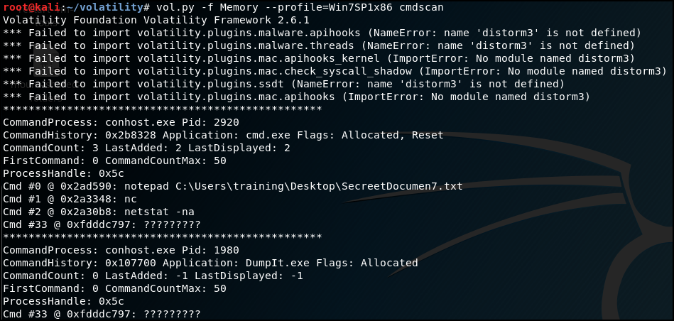 cmd에서 어떤 행동을 했는 지 확인하기 위해 cmdscan을 실행했다.