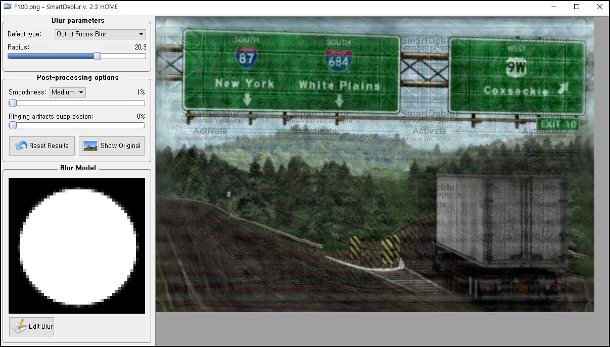 SmartDeblur 프로그램을 다운로드 하여 Out of Focus Blur 선택하고 Radius : 20.3 Smoothness : 1% 설정을 하면 글자가 보인다. (http://smartdeblur.net/download.html)