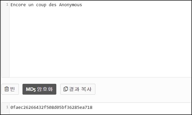 FLAG 형태의 맞게 Encore un coup des Anonymous를 MD5로 해시 암호화시켰다.