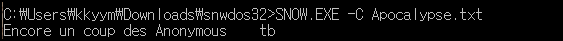 SNOW.exe 파일을 실행시키면 Encore un coup des Anonymous 값을 확인할 수 있다. (http://www.darkside.com.au/snow/)