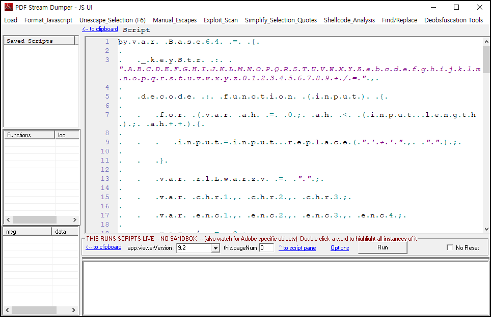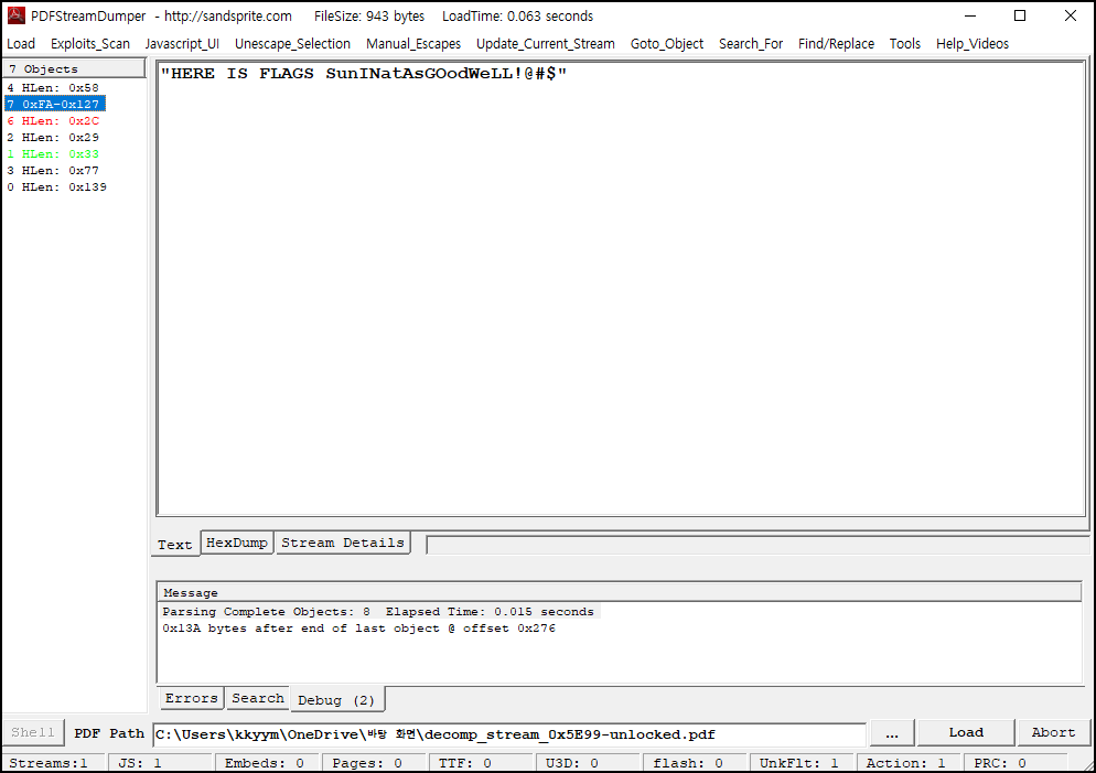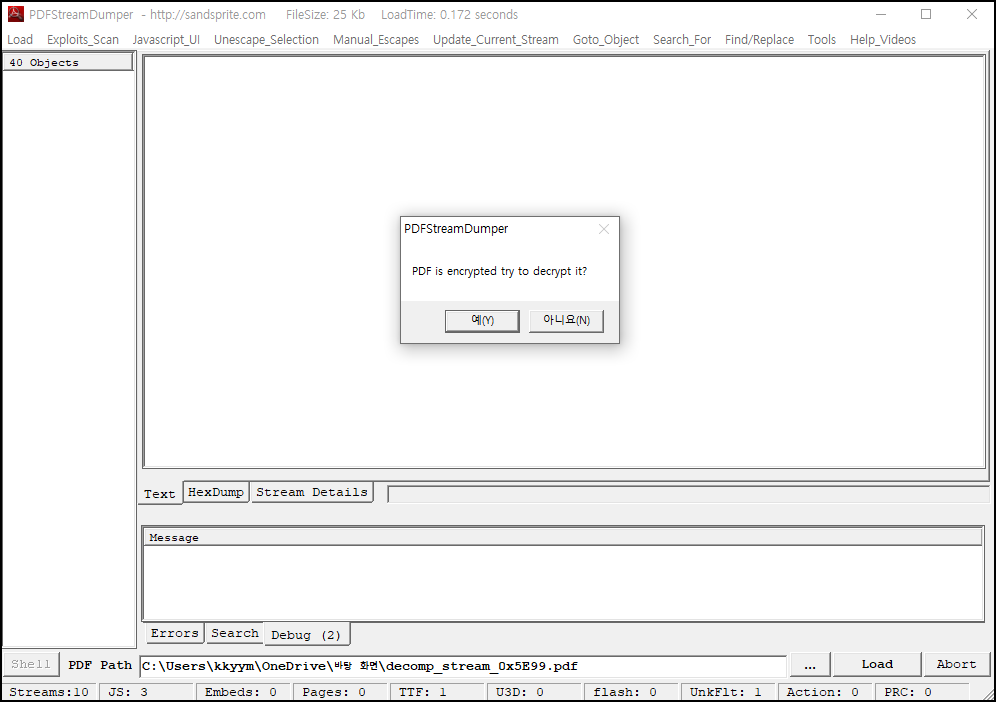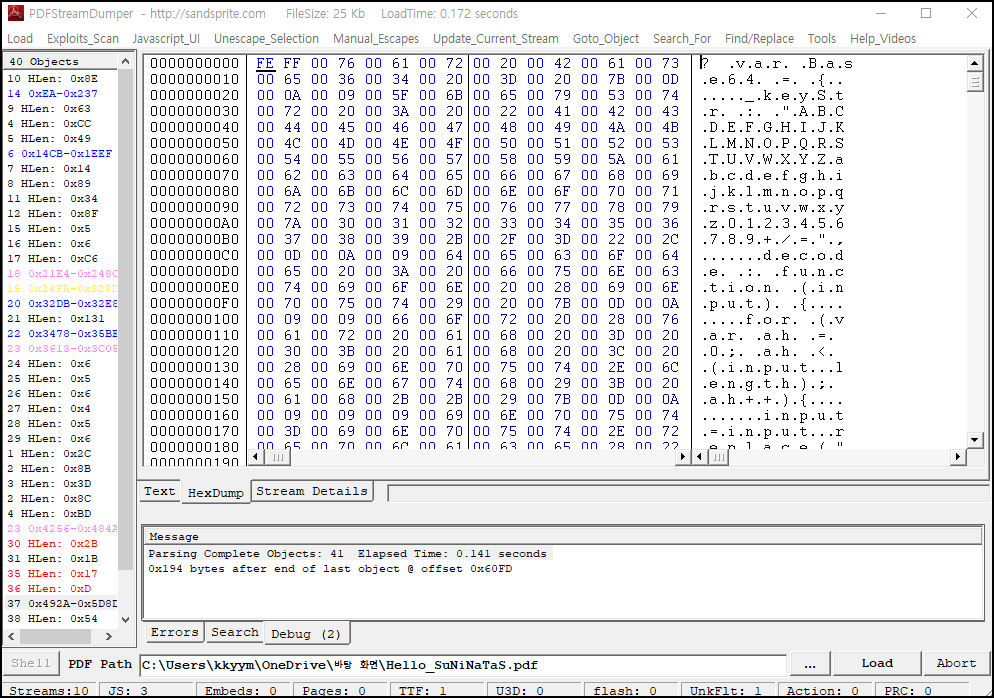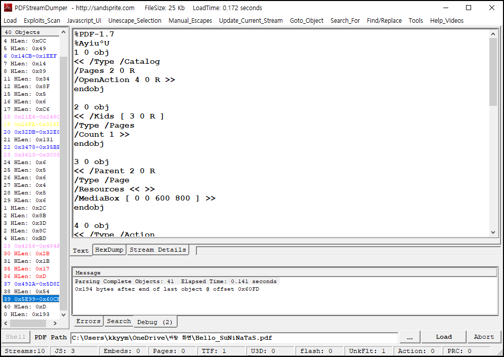 다운로드한 pdf 파일을 PDF Stream Dumper 도구를 사용하여 열어보았다.