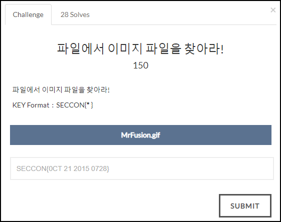 이미지 파일을 조합하면 FLAG 값을 확인할 수 있다. Flag : SECCON{0CT 21 2015 0728}