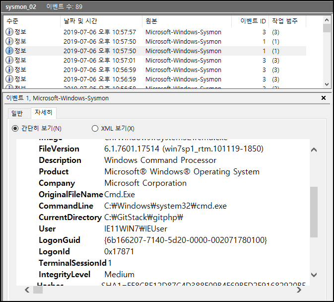 sysmon.exe 통합적인 로그 프로세스가 동작하는 것을 알 수 있다.