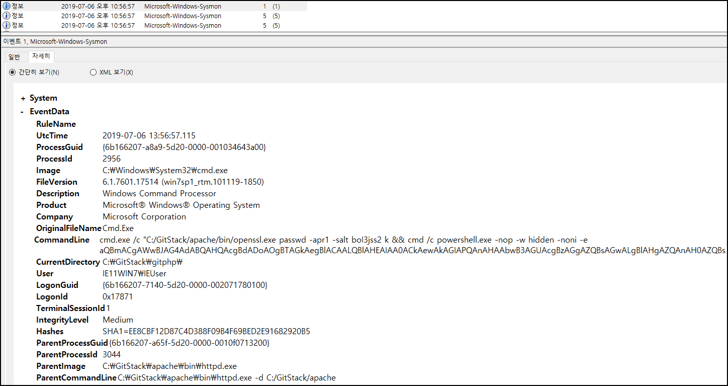 openssl을 passwd를 입력해 실행하고 cmd를 이용해 powershell을 실행시키는 것을 알 수 있다.