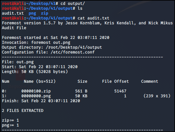 out.bin 파일을 out.png 파일로 변환 후 foremost 명령어로 카빙했다.