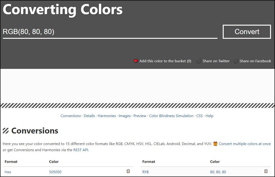 https://convertingcolors.com/사이트를 통해 RGB(80,80,80)을 보면 Hex 값이 505050이라는 것을 알 수 있다.