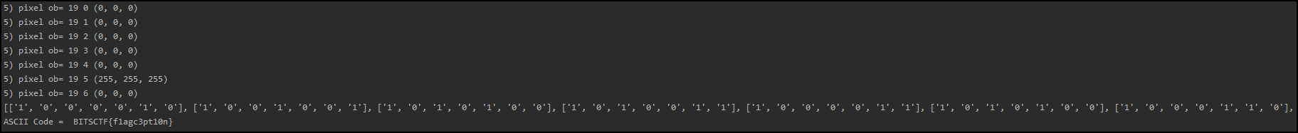 ['1', '0', '0', '0', '0', '1', '0'] 출력되는 부분을 모두 ASCII 코드로 출력하면 FLAG 값을 알 수 있다.