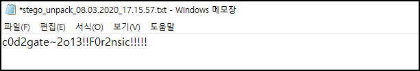 FLAG 값 c0d2gate~2o13!!F0r2nsic!!!!! 확인할 수 있다.