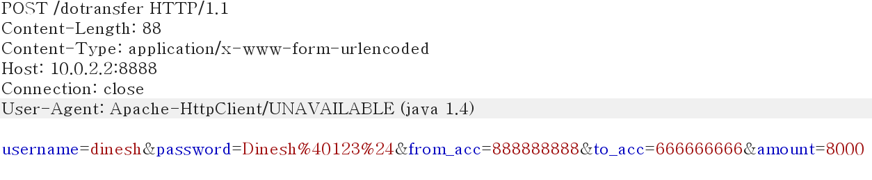 username, password 및 계좌 번호 입금 금액이 평문으로 노출되는 것을 알 수 있다.