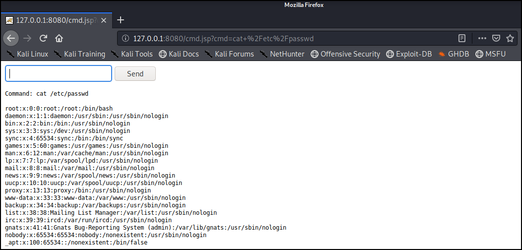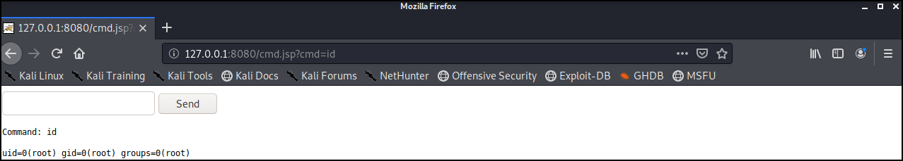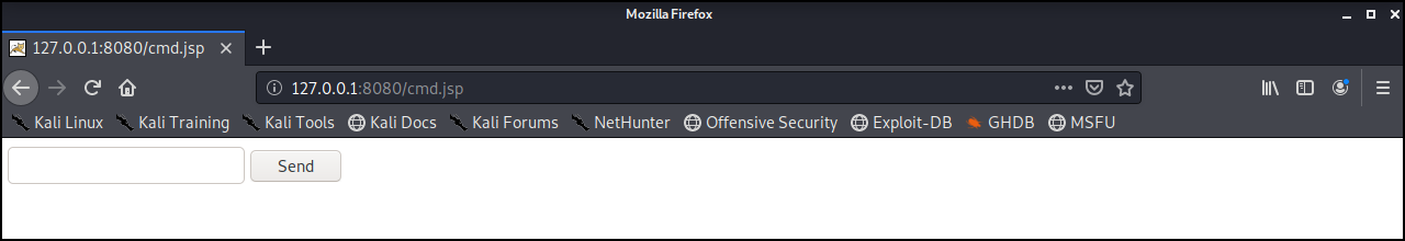 http://127.0.0.1:8080/cmd.jsp webshell 업로드가 성공한 것을 알 수 있다.