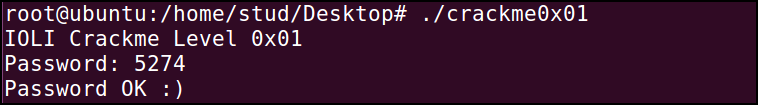 ./crackme0x01 실행 후 5274 입력 시 "Password OK :)" 메시지를 확인했다.