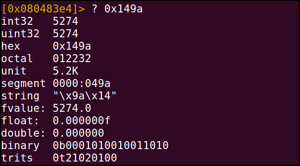 0x0804842b 값에 0x149a 값을 10진수 값을 알기 위해 ? 0x149a 입력 시 5274 10진수 값을 알 수 있다.