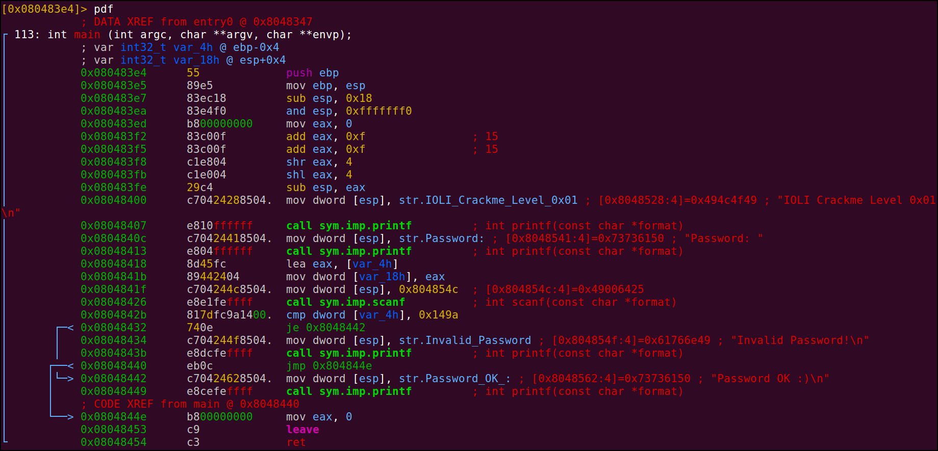 pdf 명령어는 디스 어셈블리로 보여준다. 입력한 값과 정답이 일치하면 "Password Ok :)" 다르면 "Invalid Passowrd!" 메시지를 보여주는 것을 알 수 있다.