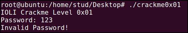 ./crackme0x01 실행을 시켜 Password 123을 입력 시 Invalid Password! 메시지를 보여준다.