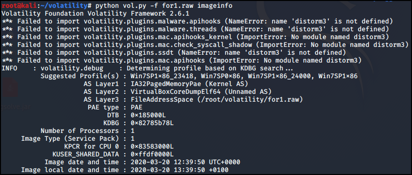 for1.raw 메모리 덤프 파일을 imageinfo를 실행했다.