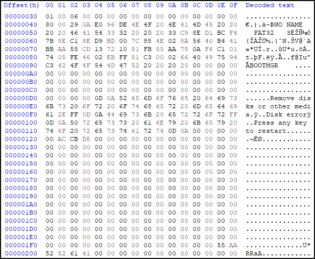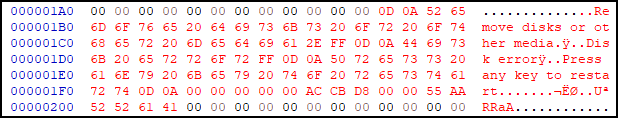 0x1FE~0x1FF 범위에 부트 레코드 손상여부를 확인하는 용도의 시그니처 0x55AA가 있어야 한다고 한다. 그러나 이 이미지파일에는 없다.