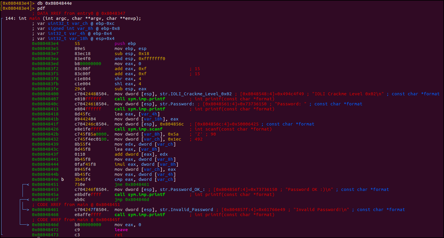 0x0804844e 주소에 db 명령어로 break point를 걸었다.