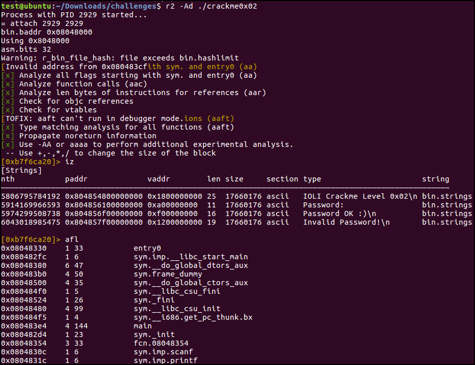 r2 -Ad 옵션으로 실행 후 iz 명령어로 문자열을 확인했고 afl 명령어로 함수를 확인했다.