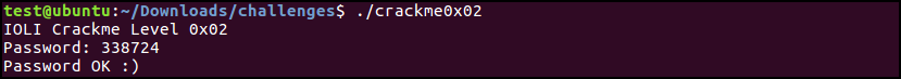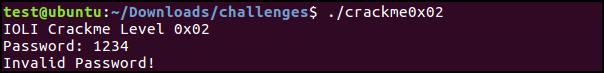 ./crackem0x02 실행 시 Pssword 입력하라고 해 1234 입력 시 Invalid Password! 메시지를 확인할 수 있다.