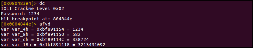 dc 명령어로 실행하면 1234를 입력하면 break point 주소에서 멈추고 afvd 명령어로 로컬 변수들의 상태를 확인했다.