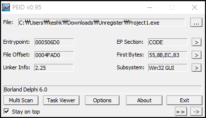 PEiD 프로그램으로 확인결과 Delphi 언어로 작성된 프로그램 언어다.