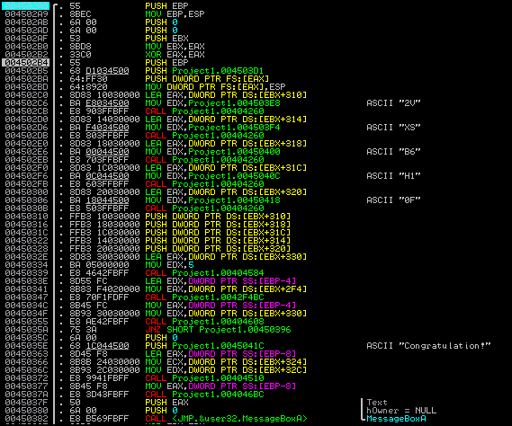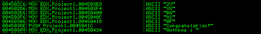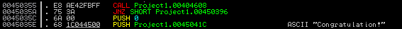 올리디버거를 보면 위와 같이 ASCII 코드가 보이고 Congatulation 메시지를 볼 수 있다.